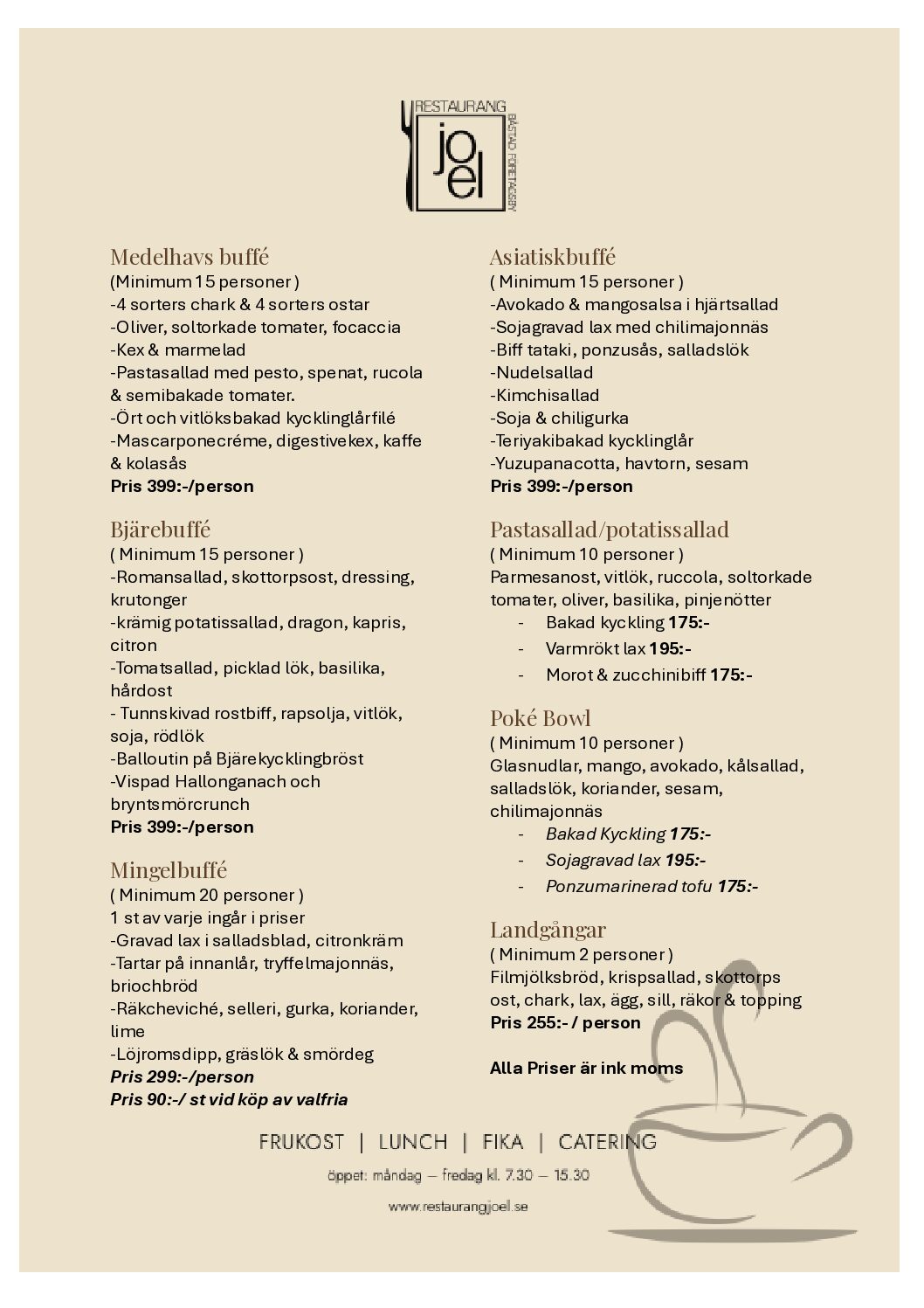 Vi skräddarsyr upplägget efter dina önskemål och erbjuder både vår mysiga restaurang som plats, eller så kommer vi till dig – i trädgården, lokalen eller vart det passar bäst.